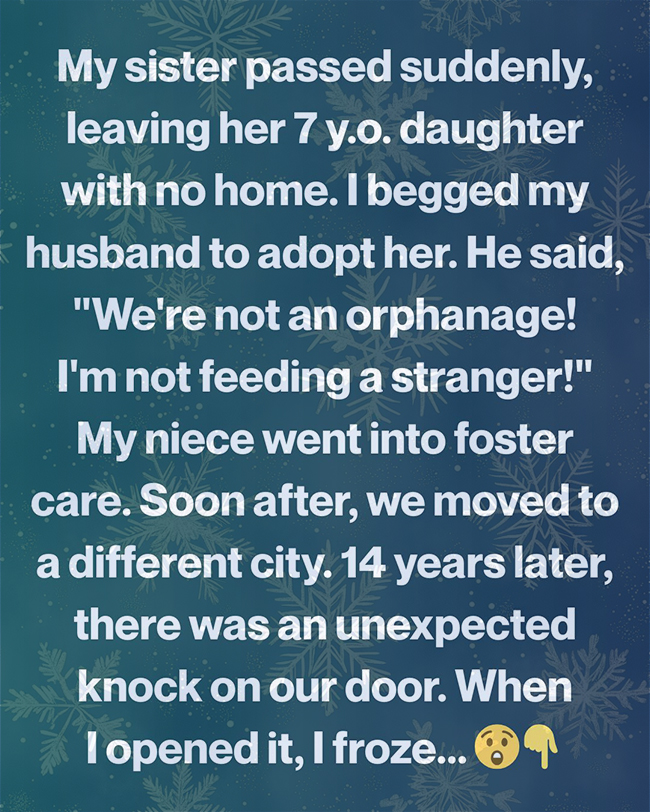 Then, one quiet evening, there was a knock at our door—a soft, hesitant knock. When I opened it, my breath caught. Standing there was a young woman with the same eyes, the same smile, the same gentle presence as my sister.