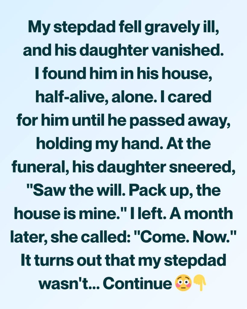 When my stepdad fell seriously ill, everyone assumed his biological daughter would step in. After all, she lived closer, grew up in that house, and never missed a chance to remind people that she was his “real family.” But days passed. Then weeks. No calls. No visits. No concern.