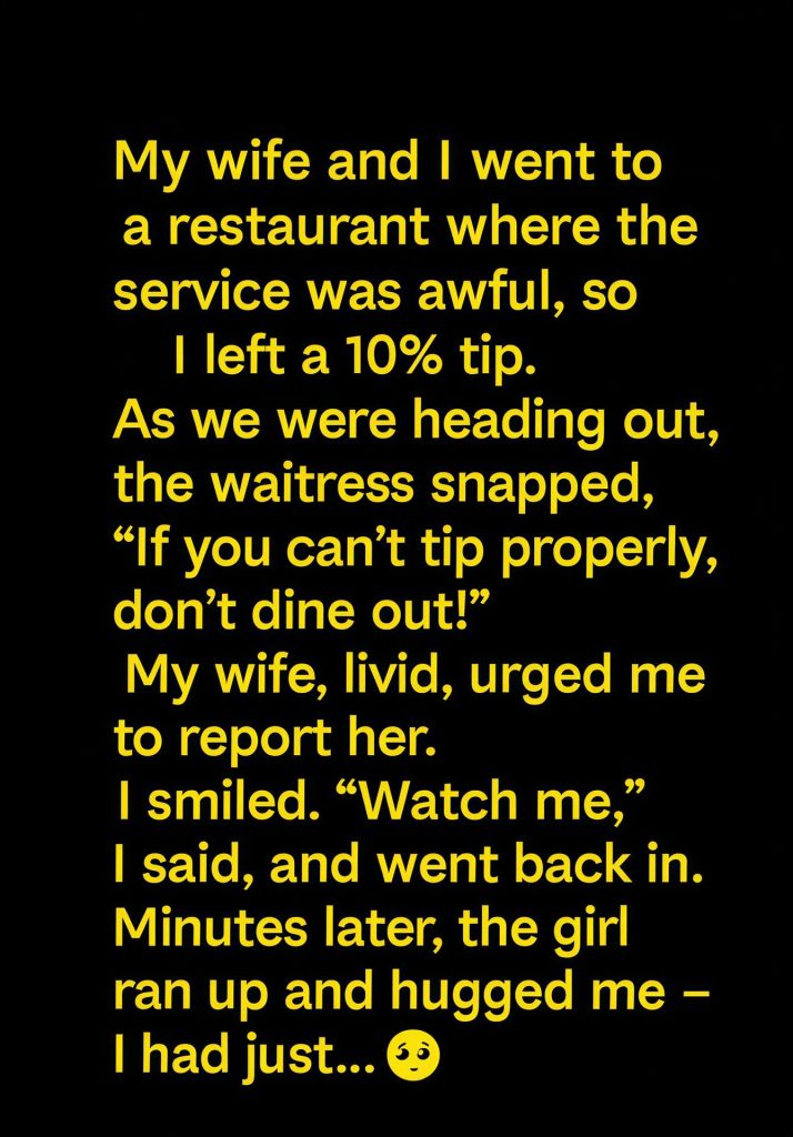 But there was something in the waitress’s voice that didn’t sound rude—it sounded worn down. I told my wife, “Just watch,” and walked back inside. The manager approached, ready for a complaint, but instead I told him the waitress seemed overwhelmed, not ungrateful. He sighed deeply and explained she’d been working double shifts while caring for a sick family member. The staff, he admitted, was stretched thin.