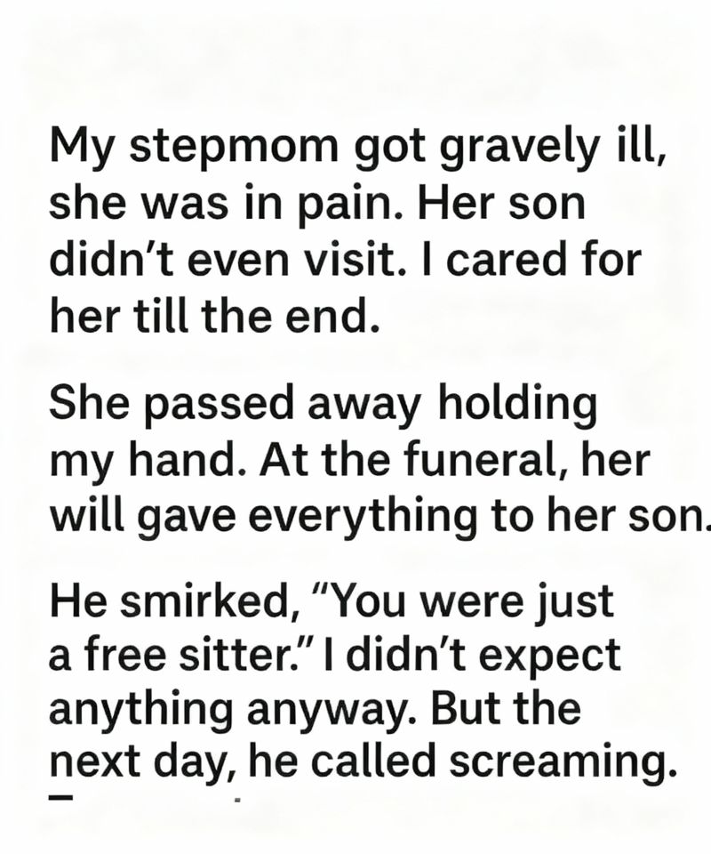 I cooked her meals, organized her medications, cleaned the house, and stayed beside her through long, restless nights. We talked about small, ordinary things—favorite recipes, old memories, moments from before sickness took over. In those hours, she wasn’t my stepmother. She was simply someone who needed company, and I was glad to give it.