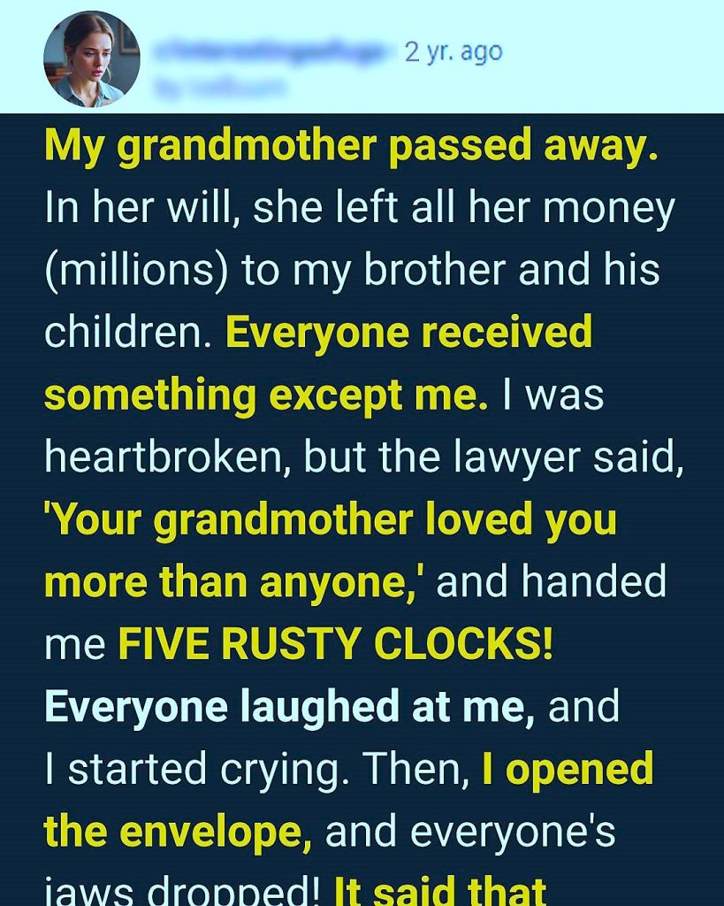 They Laughed When My Grandmother Left Me Five Rusty Clocks—Until I Opened the Envelope…