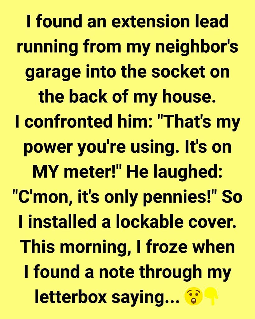 “Mate, that’s my power you’re using,” I said, trying to keep my voice calm. “It’s on my meter.”