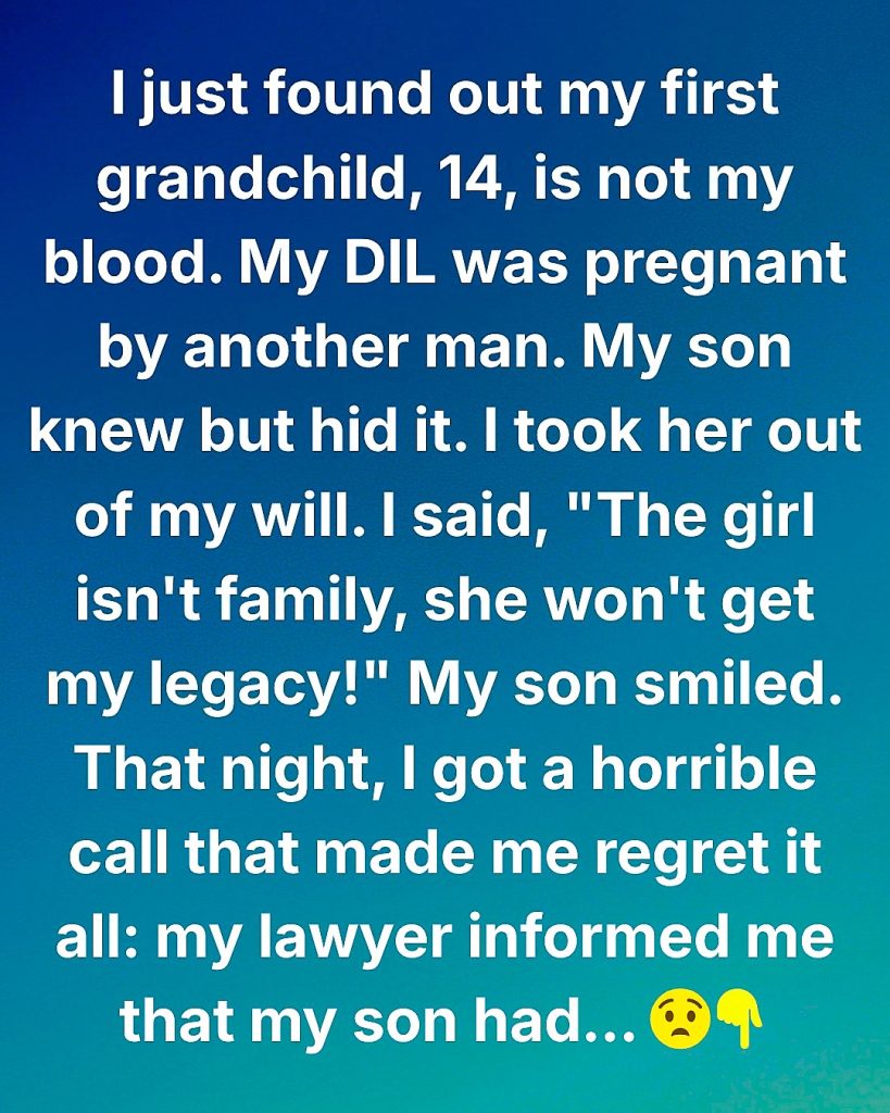 Recently, I uncovered something that completely turned my world upside down: my first grandchild, now 14, is not biologically mine. My daughter-in-law had been pregnant by another man when she married my son. What hurts even more is that my son knew the truth all along but kept it from me. I’m convinced they would have hidden it forever if I hadn’t discovered it myself.