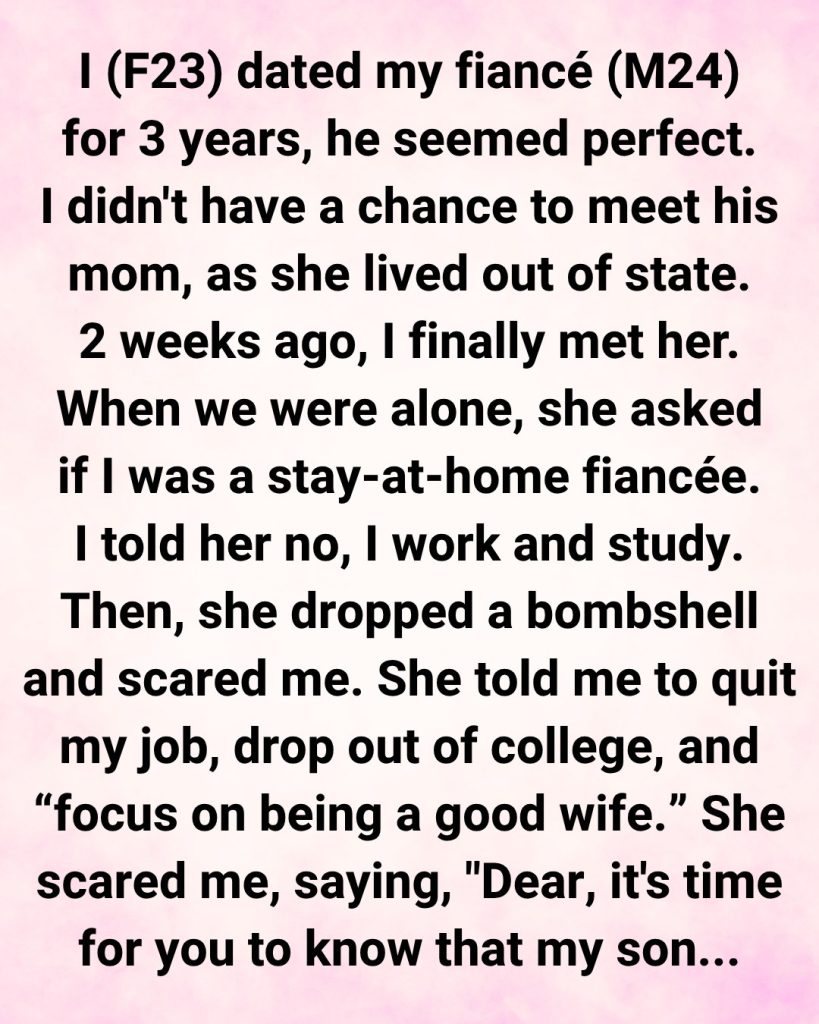 When she and I were alone, she asked if I was a stay-at-home fiancée. I told her no—I work and study. Then she dropped a bombshell that genuinely scared me. She told me I needed to quit my job, drop out of college, and “focus on being a good wife.”