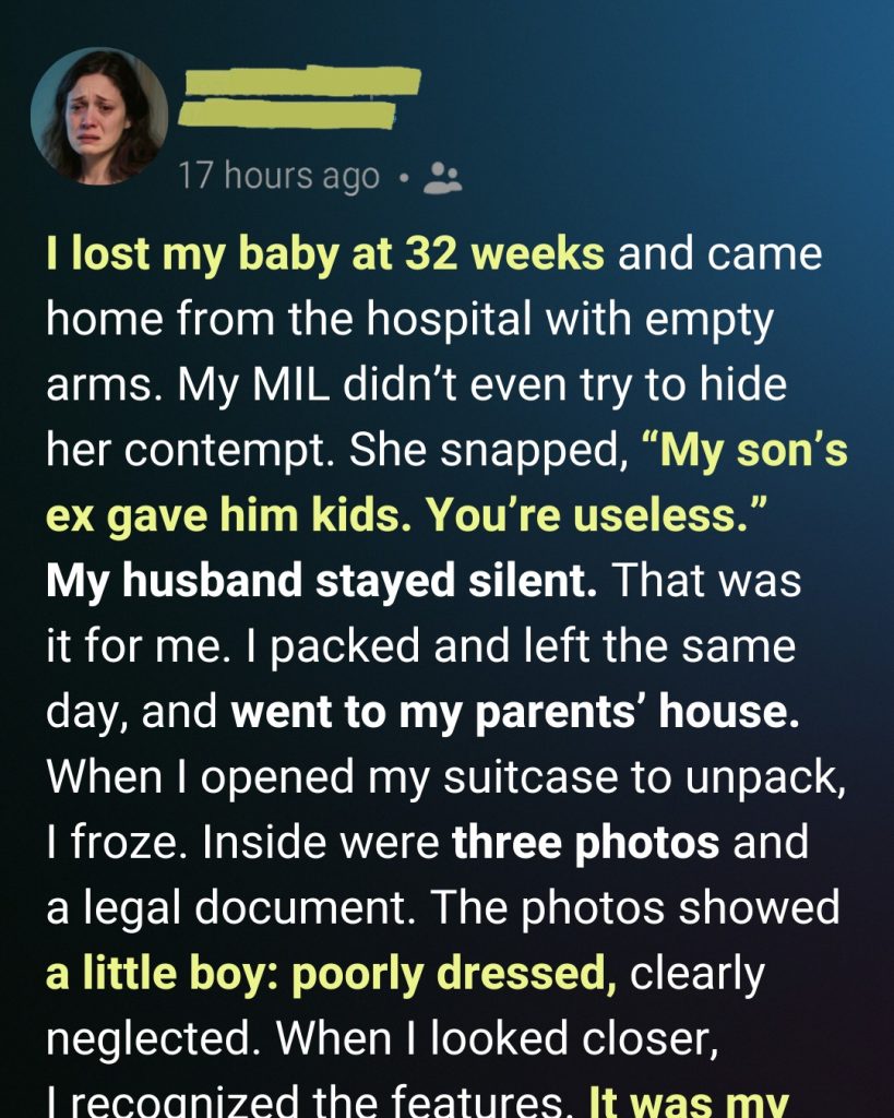 At the bottom of my suitcase were three photographs and a legal document I hadn’t packed. The photos showed a little boy—thin, poorly dressed, eyes too old for his face. In one picture he stood barefoot on a cracked sidewalk. In another, he slept curled against a wall, ribs visible beneath his shirt.