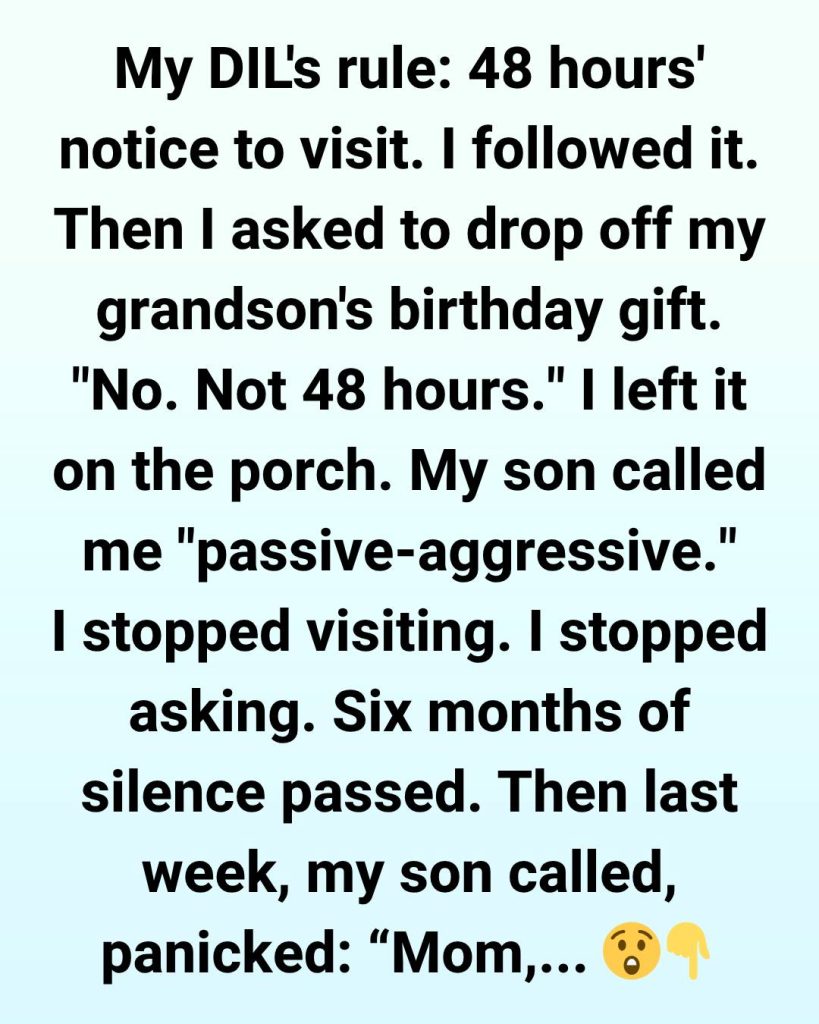 My daughter-in-law set a rule: I had to give 48 hours’ notice before visiting my grandson. I thought it was excessive, but I followed it faithfully because I didn’t want any conflict. I’d text her two days ahead, wait for her approval, and only visit at the exact time she allowed.