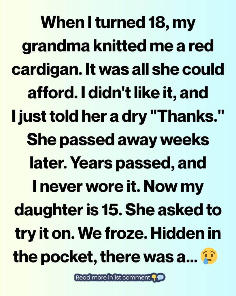 At eighteen, I wanted independence, not reminders of how little money we had. I wanted concerts, friends, noise, life. A cardigan felt like something from another era—hers, not mine.