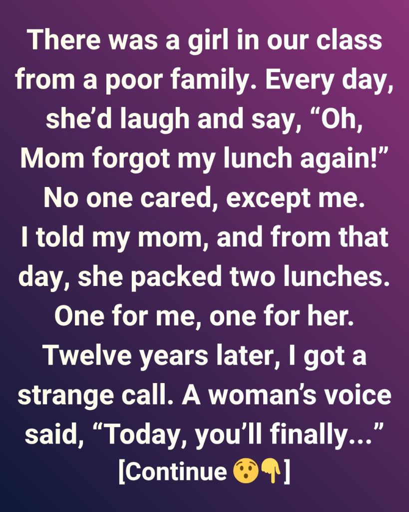 There was a girl in our class from a poor family. Every day, she’d laugh and say, “Oh, Mom forgot my lunch again!” No one cared, except me. I told my mom, and from that day, she packed two lunches. One for me, one for her.