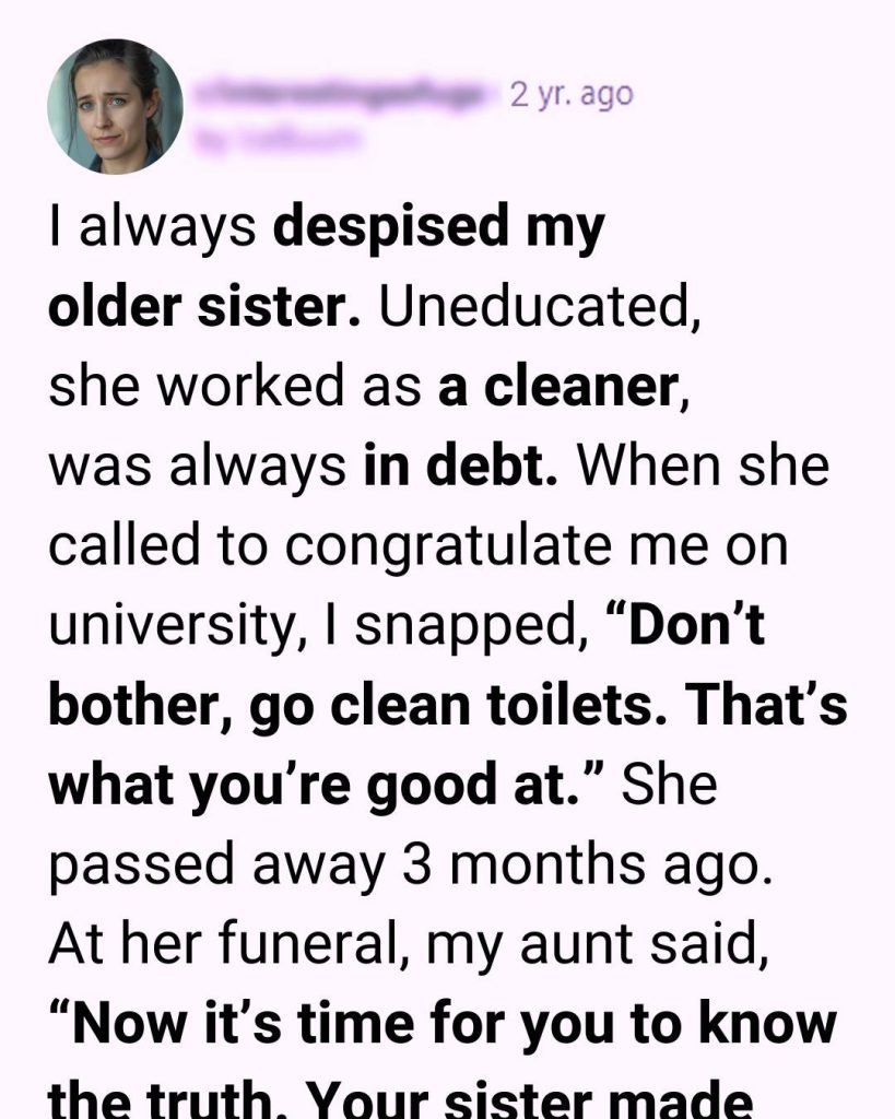 “She never got a proper education or a good job because she wanted you to have it all,” my aunt said softly. “It was a family secret. She forbade everyone from telling you. She said if you knew, you’d feel pressured. Or guilty. She wanted you to succeed freely.”