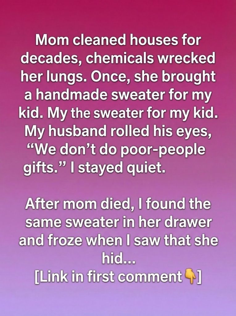 For as long as I could remember, my mother worked quietly in the background of other people’s lives. She spent decades cleaning houses that were not her own, breathing in harsh products day after day so she could provide stability and warmth for our family. She never complained. To her, work was dignity, and love was shown through effort rather than words. One winter afternoon, she arrived at our home holding a carefully folded sweater she had made by hand for my child. The stitches were uneven, the colors simple, but her eyes carried pride. My husband glanced at it, scoffed lightly, and muttered something thoughtless about not using “those kinds of gifts.” I felt my throat tighten, but I said nothing. My mother smiled politely, pretending she hadn’t heard, and left soon after.