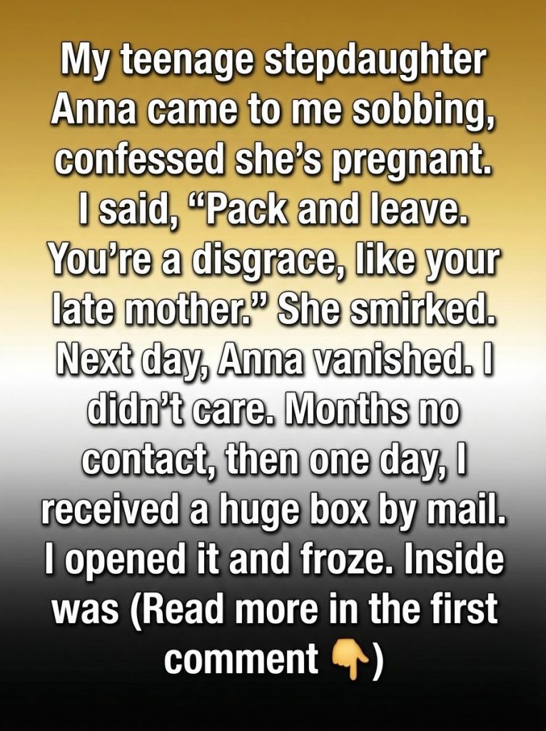 Several months later, a large box arrived at my door with no return address, only my name written carefully on top. Confused, I brought it inside and opened it slowly. Inside were photo albums, school awards, handwritten notes, and a letter. Anna wrote about the pain she felt that night, but also about her journey since leaving—finding guidance, rebuilding confidence, and learning resilience. She explained that the box wasn’t meant to reopen wounds, but to share her truth and to let me see her not as a problem, but as a person still growing and learning.