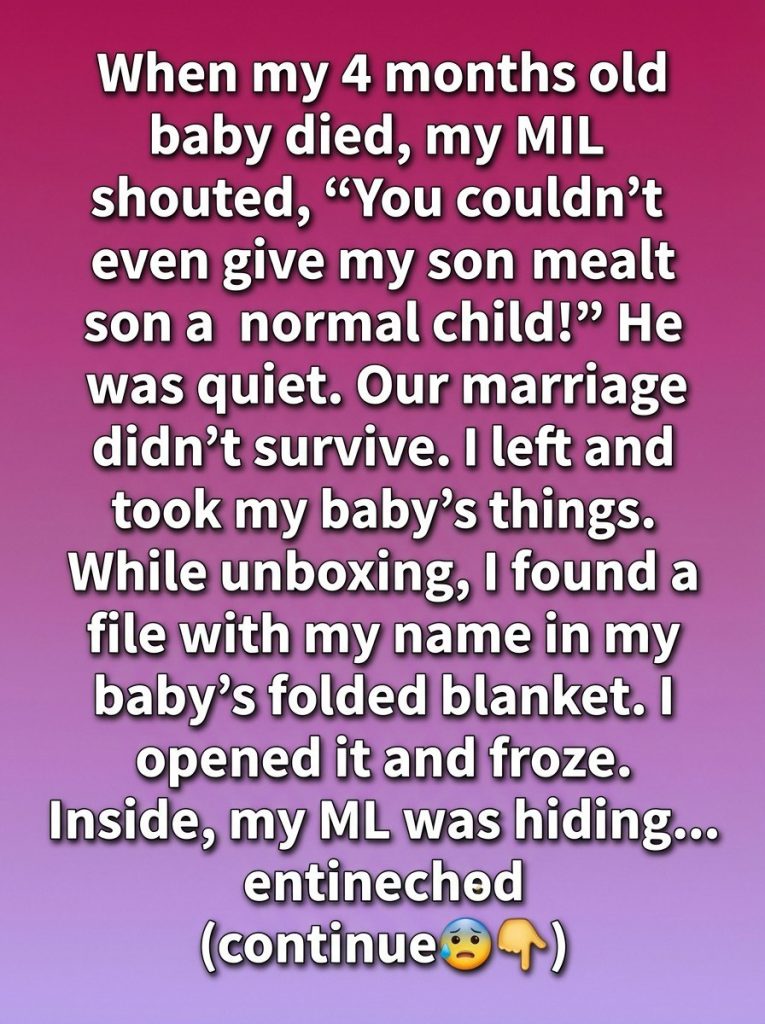 Grief has a way of distorting time, memory, and even the people we thought we knew best. After losing my baby at just four months old, the world became unbearably quiet. Every sound felt too loud, every silence too heavy. In the days that followed, emotions ran high, and words were spoken that could never be taken back. One painful confrontation marked the beginning of the end of my marriage. Instead of comfort, I was met with anger and blame, and the absence of support made the loss feel even deeper. Eventually, I gathered what little strength I had left and left, taking only my baby’s belongings—small items that felt like the last physical connection to the child I loved so deeply.