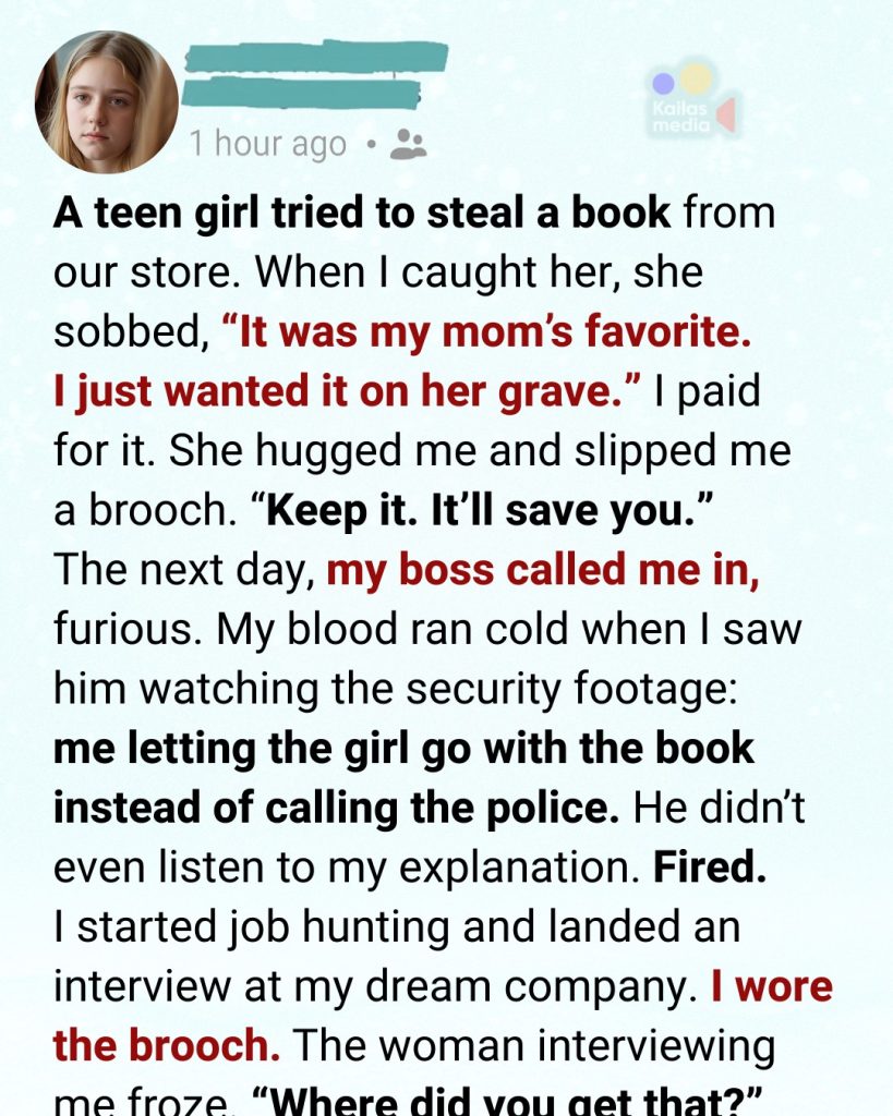 “I wasn’t trying to steal for fun,” she cried. “It was my mom’s favorite book. She used to read it to me before she got sick. She died last year. I just… I wanted to put it on her grave. I wanted her to have it.”
