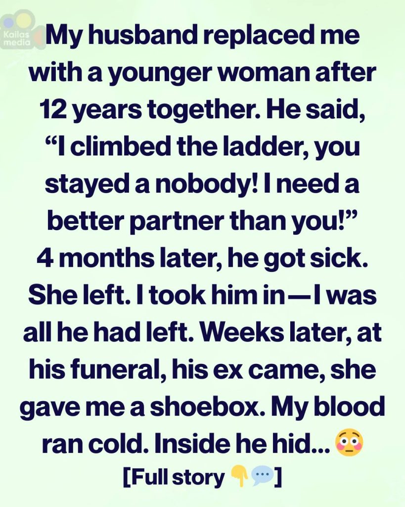 At his funeral, I saw her—the younger woman. She hovered at the edge of the crowd, unsure, like someone who didn’t quite belong. When everyone else had left, she approached me holding a shoebox.