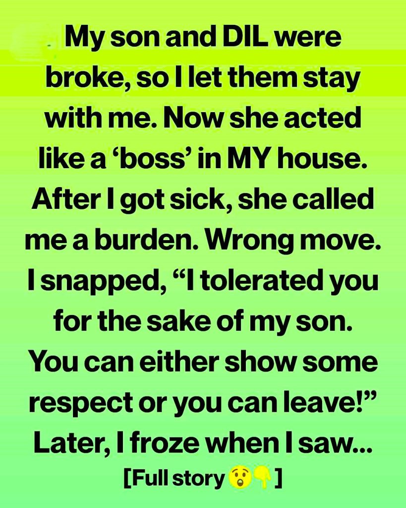 “I tolerated you for the sake of my son,” I told her, my voice shaking with anger. “You can either show some respect in my home, or you can leave.”