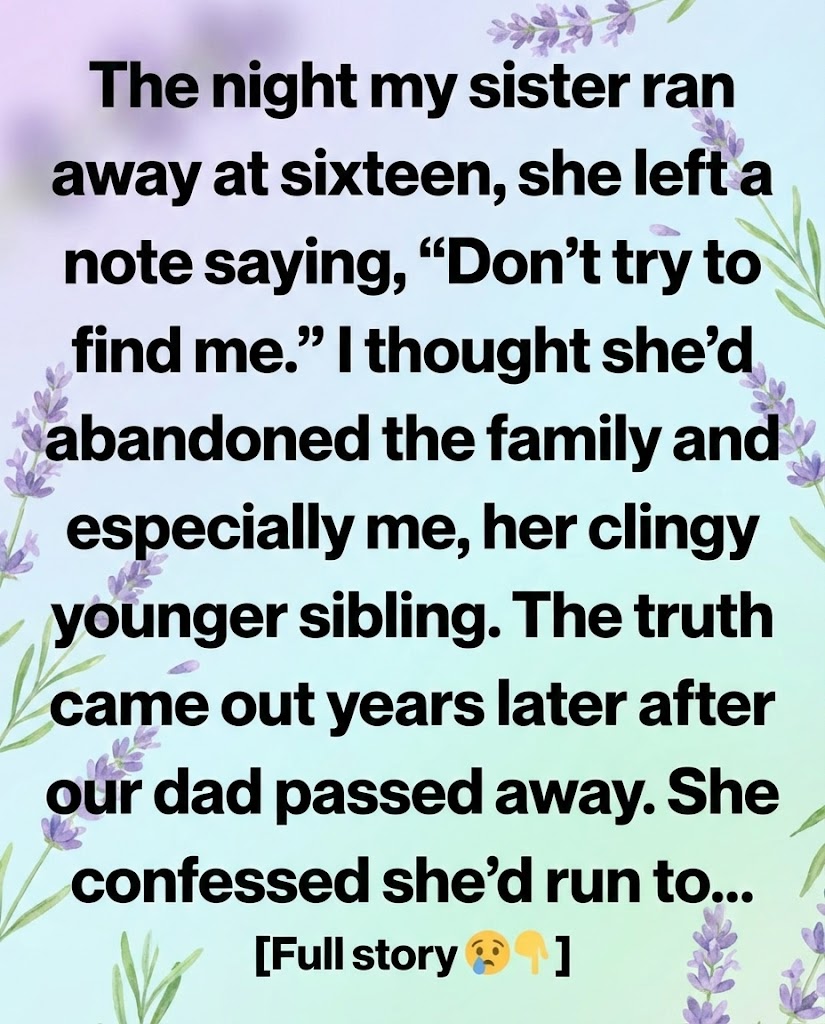 We didn’t see her again for a long time. Postcards came sometimes. A phone call once a year if we were lucky. Mom defended her weakly. Dad never spoke her name. And I grew up with a hole where my sister should have been, telling myself I didn’t need her.