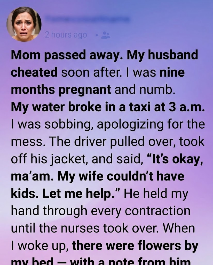 The night my water broke, it was 3 a.m. I was alone in our apartment. I called a taxi because I didn’t trust myself to drive. By the time I climbed into the back seat, contractions were already rolling through me like waves. Then it happened — water everywhere. I panicked, sobbing, apologizing over and over.