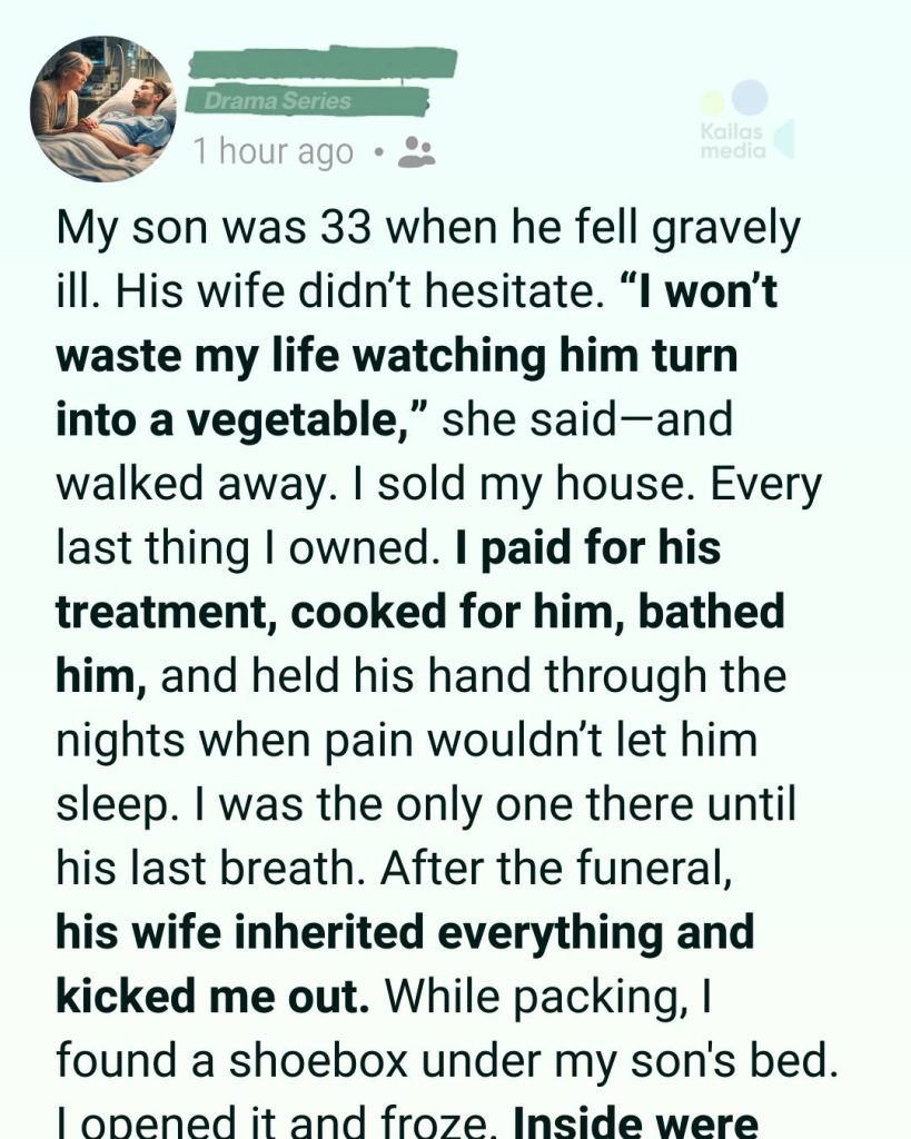 I packed silently. I folded his clothes carefully, lingering over the scent that still clung to them. When I went under his bed to grab an old blanket he liked, my hand brushed against something hard—a shoebox pushed far back into the corner.