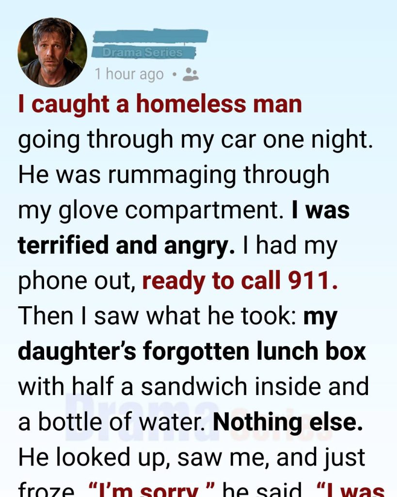 He looked down at it like it might burn him. “Just this,” he said, opening it with clumsy fingers. Inside was half a peanut butter sandwich wrapped in wax paper and a bottle of water. He didn’t touch anything else. Not the change in the cup holder. Not the charging cable. Nothing.