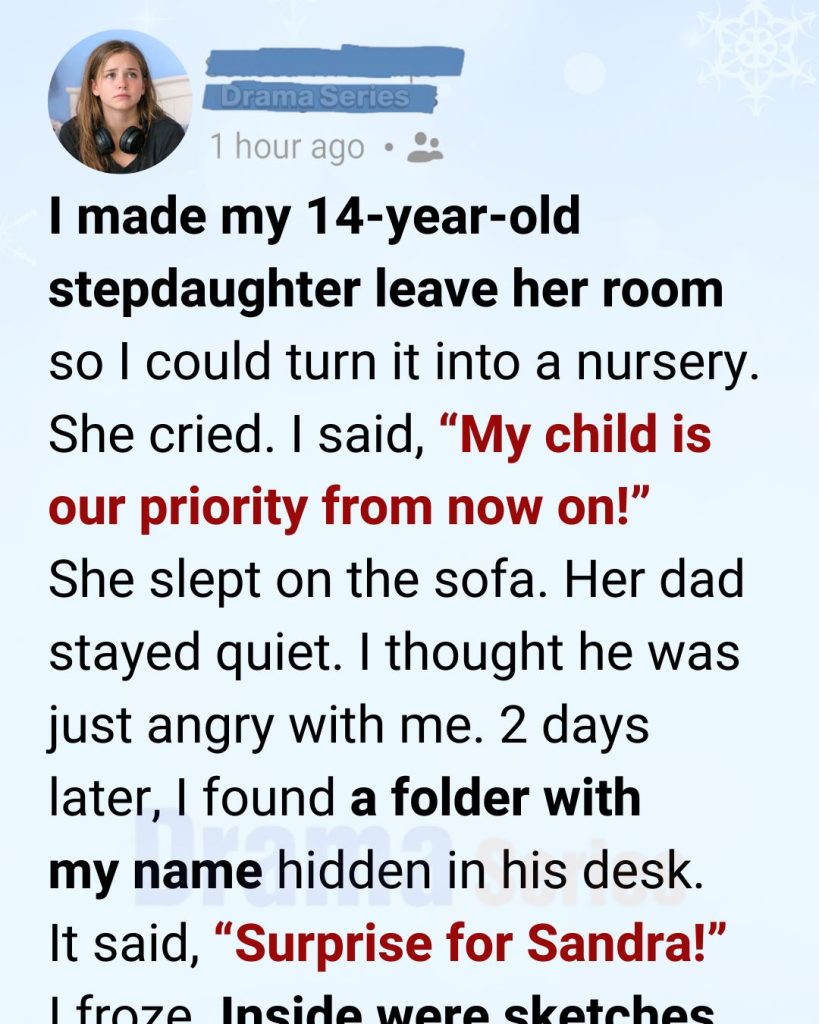 Inside were sketches—detailed, careful drawings of Emma’s room transformed into a shared space. A crib tucked neatly beside her bed. Shelves built upward instead of outward. Under-bed storage. Soft colors that blended both of their worlds. There were notes in the margins: “So baby doesn’t wake Emma,” and “Extra space for her desk.”