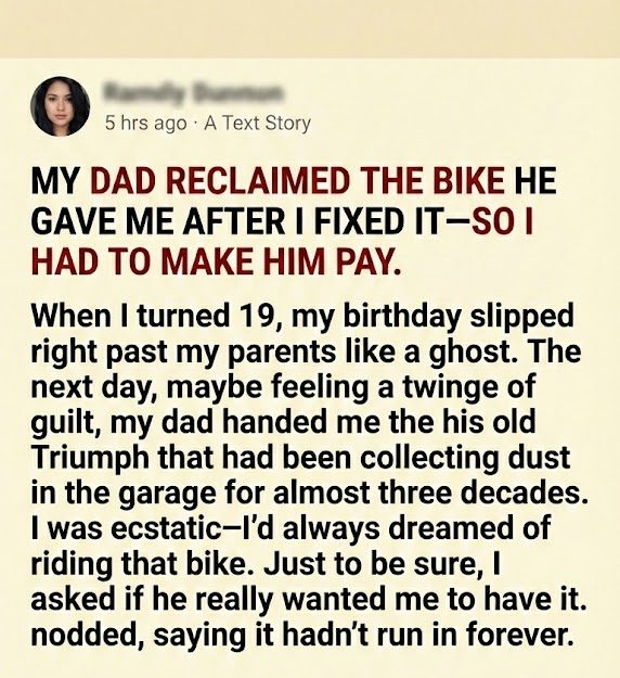 The paper slipped from my trembling fingers, fluttering to the floor like a dying bird. My vision blurred. A sound escaped me, a ragged gasp of absolute horror. He hadn’t just reclaimed the bike; he had reclaimed the last piece of a life I never knew was mine.