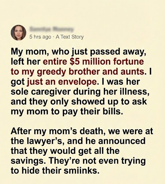 My breath hitched. A wave of nausea washed over me. Just this? After all these years? All the sacrifices, all the unspoken longing for her affection? My siblings exchanged uncomfortable glances. They knew our relationship had always been strained, distant. But this felt like a final, definitive declaration of my place in her heart: an afterthought, barely worth the paper this envelope was made from.
