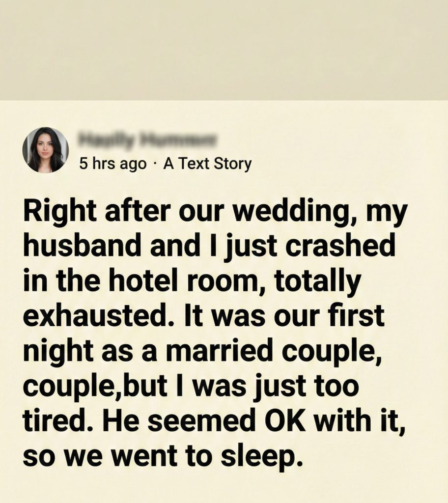 On our wedding night, I was exhausted and hesitant to start the celebration as expected. When I asked Scott for some time to talk instead, he agreed, though his disappointment was palpable. However, in the middle of the night, I awoke to find our bed shaking.