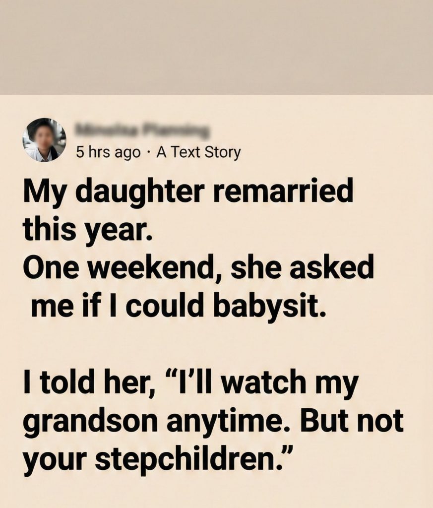 I hesitated. “I’ll watch my grandson anytime. But not your stepchildren.”