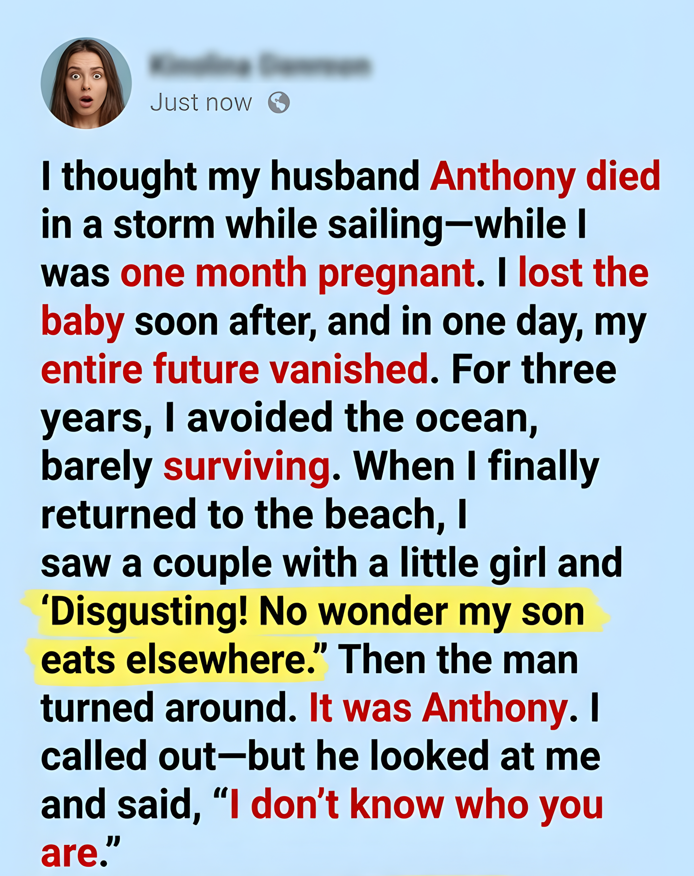 I thought I had buried my past along with my husband, who I believed had died three years ago. But on a distant beach, I saw him — alive, smiling, holding hands with a woman and a little girl. My world shattered all over again. Was it really him? And why was he with another family?