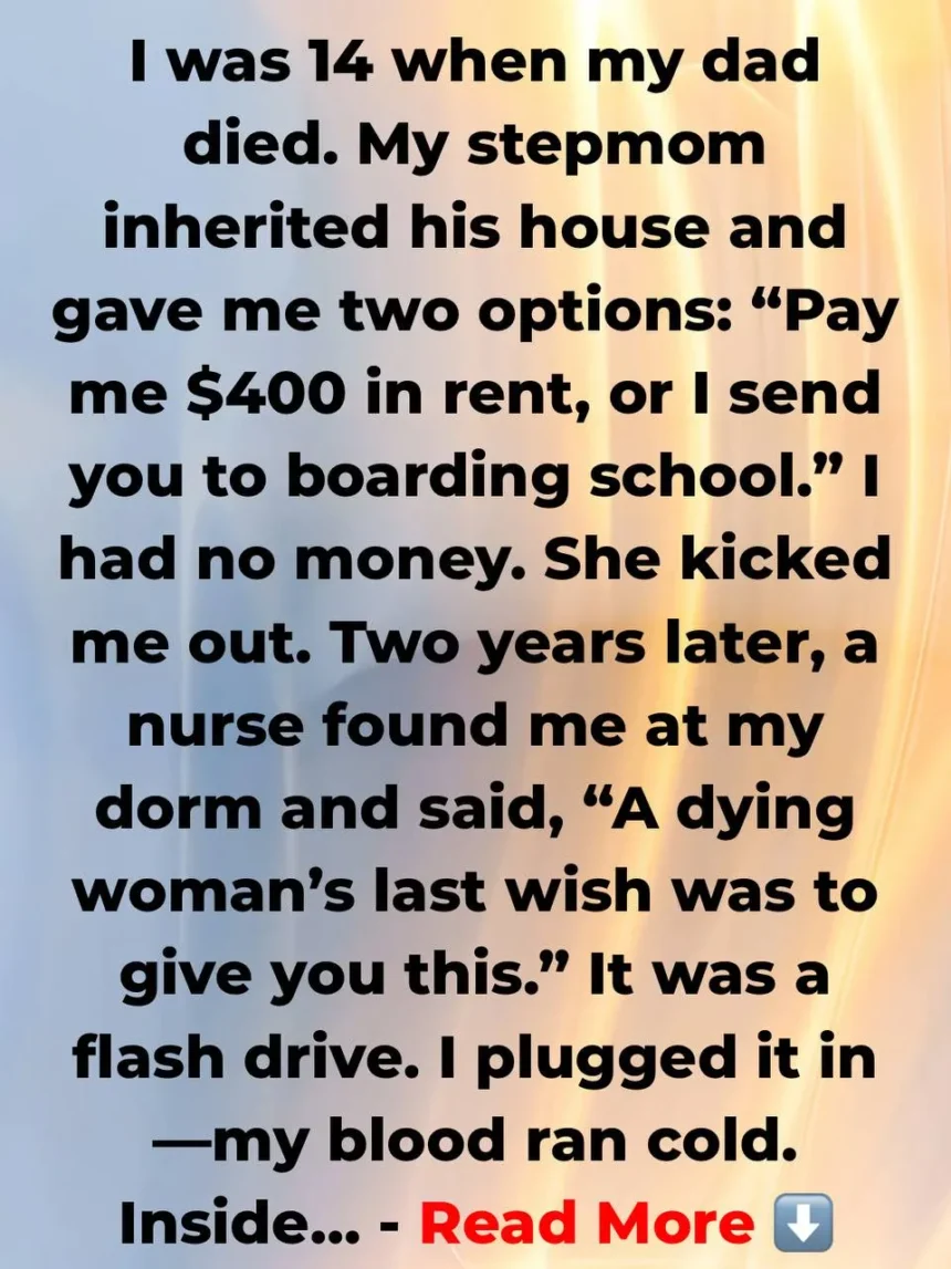 - I was 14 when my dad died.My stepmom inherited his house and gave me 2 choices: “Pay me $400 rent or I’ll ship you to boarding school!” I had no money. She kicked me out.