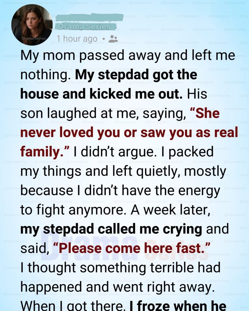 At the reading of the will, I sat at the far end of the table, hands folded, eyes fixed on the wood grain. I didn’t expect much. My mother and I were close, but life had been complicated ever since she remarried. Still, when the lawyer cleared his throat and said the house, the savings, everything—went to my stepfather, my chest tightened.