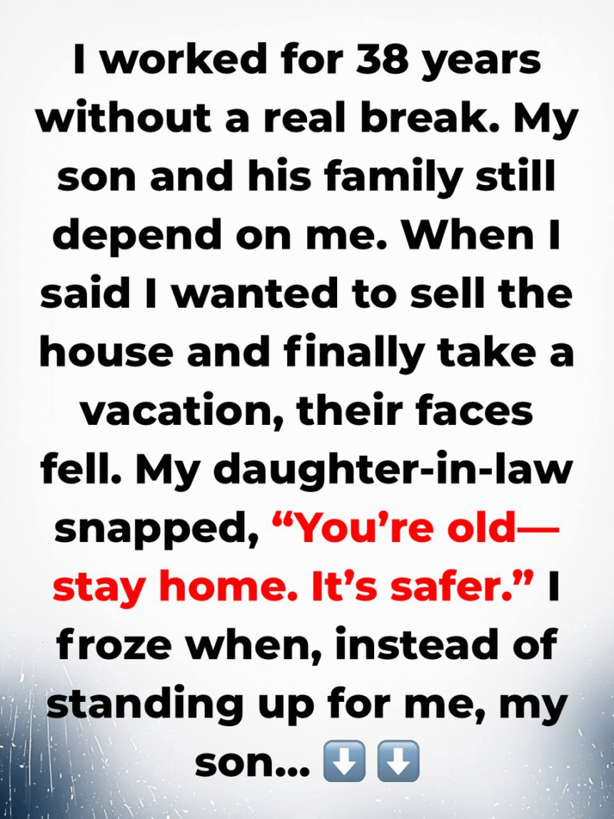 - I worked for 38 years, no breaks.My son and his family still rely on me. I told them I want to sell the house and finally take a vacation.