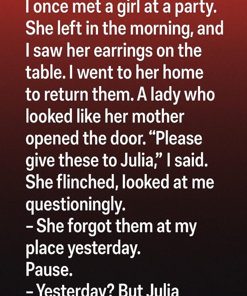 She did not ask why I was there. She did not challenge my explanation. Instead, she sat at the kitchen table, turned the earrings slowly in her hand, and said in a quiet voice that Julia had not lived there for years.