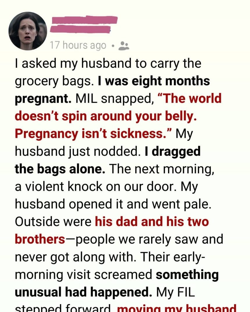 Before he could answer, my mother-in-law snapped from the kitchen, her voice sharp and dismissive. “The world doesn’t spin around your belly,” she said. “Pregnancy isn’t a sickness.”