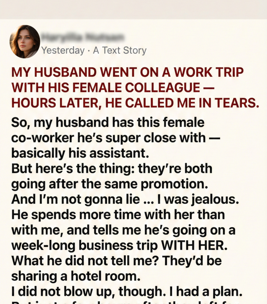 So, my husband has this female coworker he’s extremely close with—basically his assistant. They talk constantly, work late together, travel together. I tried not to be that wife, but I won’t lie… I was jealous.